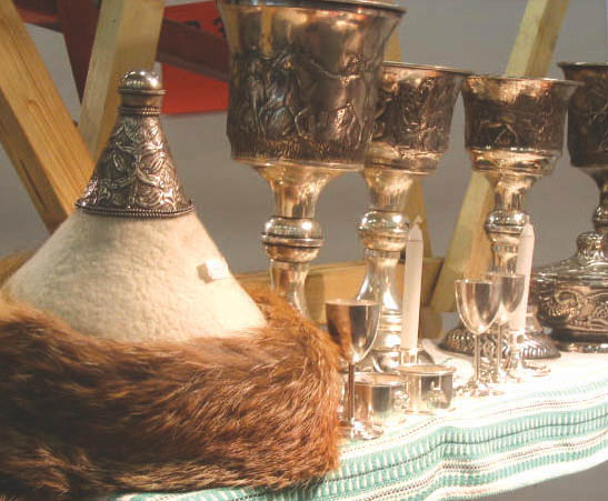 SÜVEG CSÚCShonfoglalás-kori süveg nemezből, rókaprémmel és ezüst süvegcsúcssal. Mögötte egyedi készítésű ezüstözött serlegek. HAJFONAT DÍSZ ![]() az ősi hajfonat díszek újkori változata hajcsat formájában |