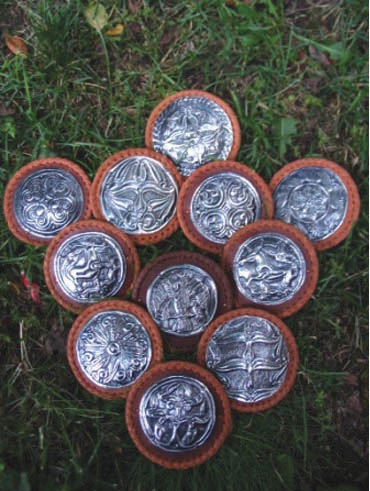 minden lemezhez kérhető szíjvég és díszítő veret FEHÉREGYHÁZI TARSOLYLEMEZbőrrel fonott tarsolyon BÁRÁNDI TARSOLYLEMEZ ![]() barna fonott bőr tarsolytáskán | ![]() |