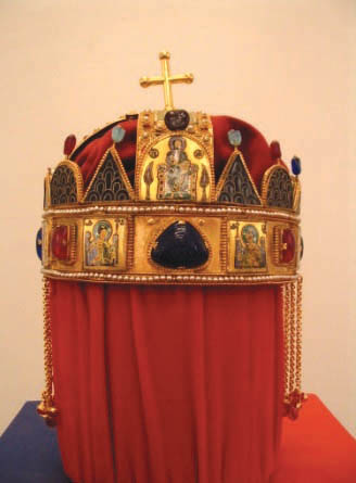 MAGYAR KORONA MÁSOLATa visegrádi Fellegvárban látható, aranyozott színesfémből készült, miniatűr festett zománcképekkel KÖZÉPKORI DÍSZSERLEG ![]() szőlőleveles serleg, középkori címerekkel |